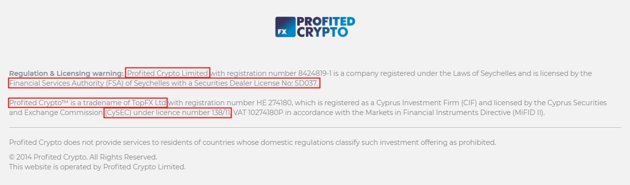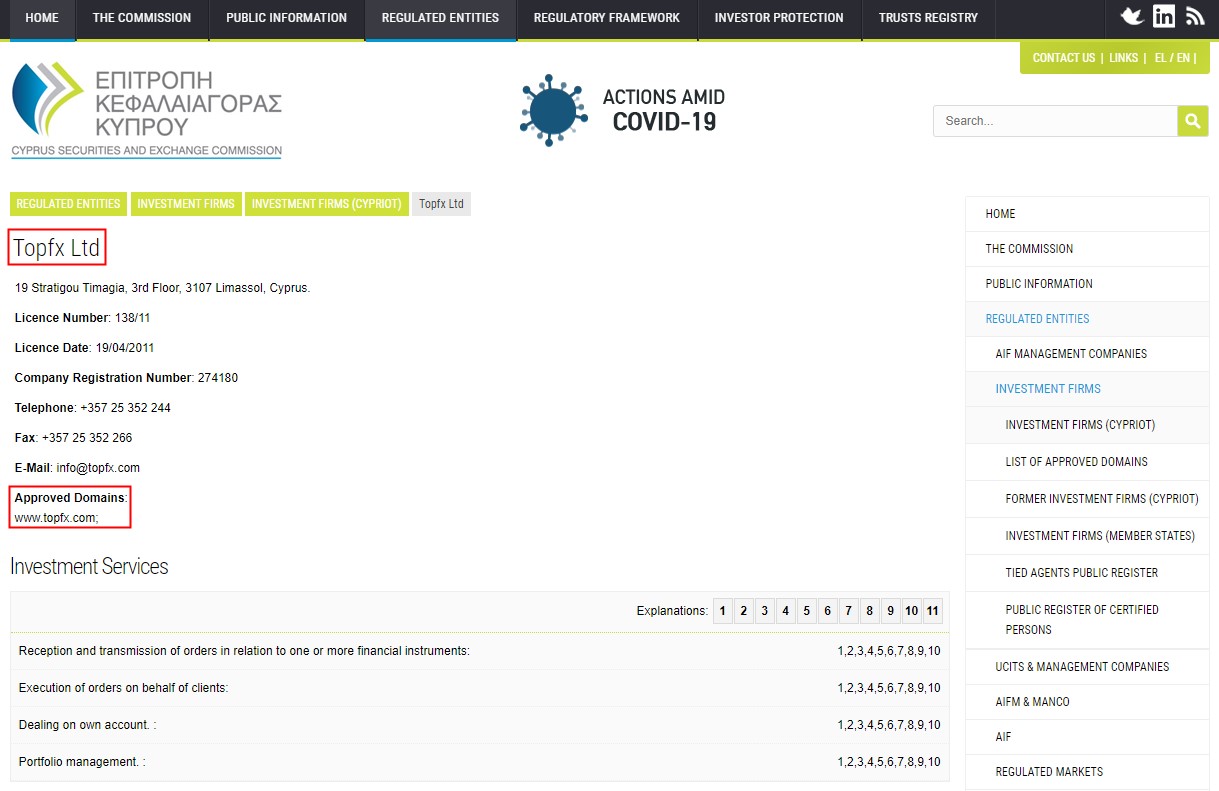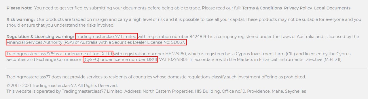 Even their company names are all in the format - 'Trade Name' +LTD. What's more, the regulatory information they claim is also the same! The fraudsters all claim to be the brand names of TopFX Ltd, a company regulated by the Cyprus Securities and Exchange Commission (CySEC) with regulatory number 138/11.