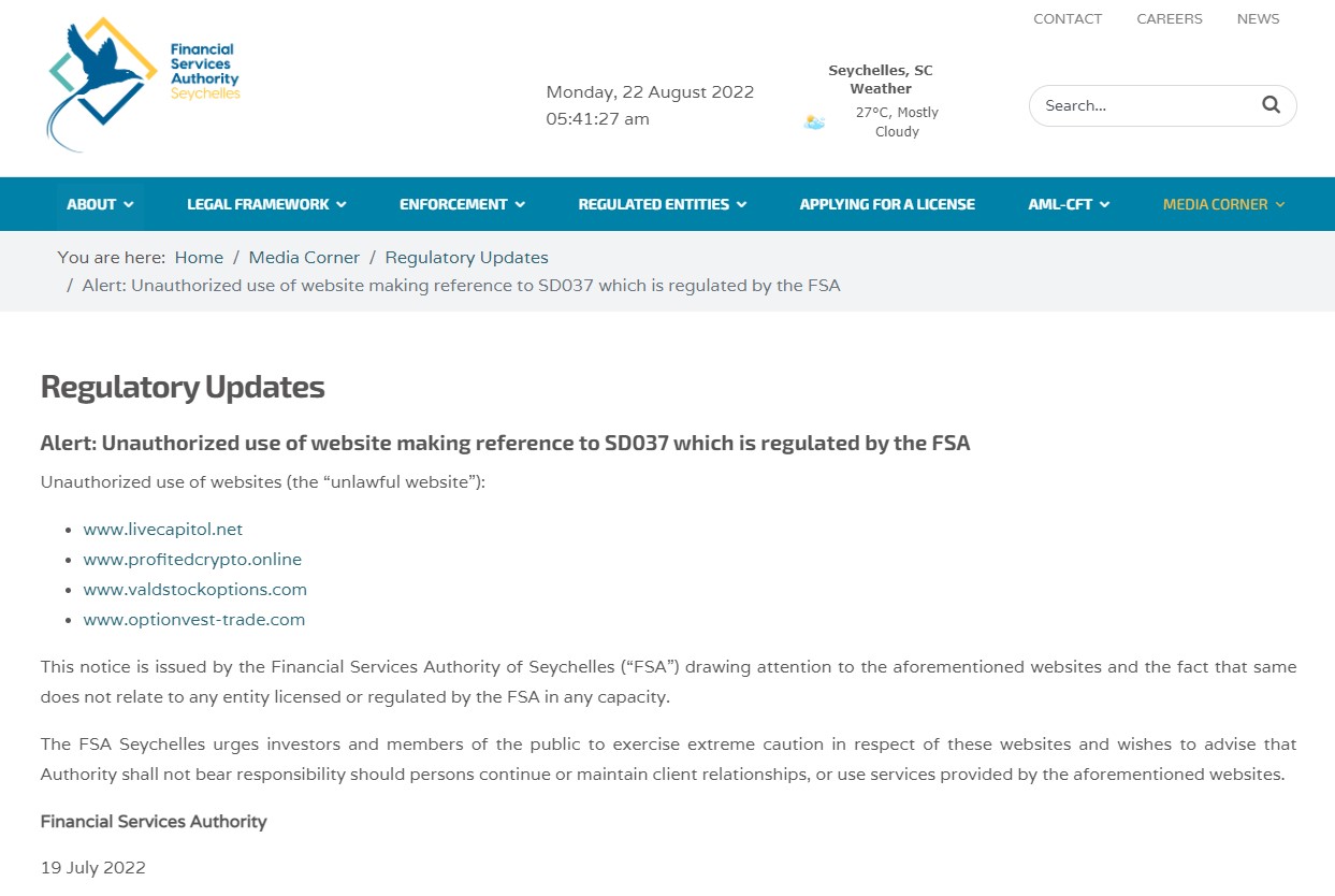 Recently, the Seychelles Financial Services Authority (Seychelles FSA) warns an unregulated broker named Live Capitol. At first, we thought the broker was just another scam that investors often see on the forex market. However, as our investigation advanced, we found another four unregulated brokers are highly similar to Live Capitol.