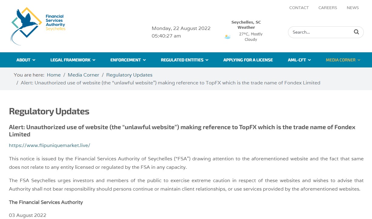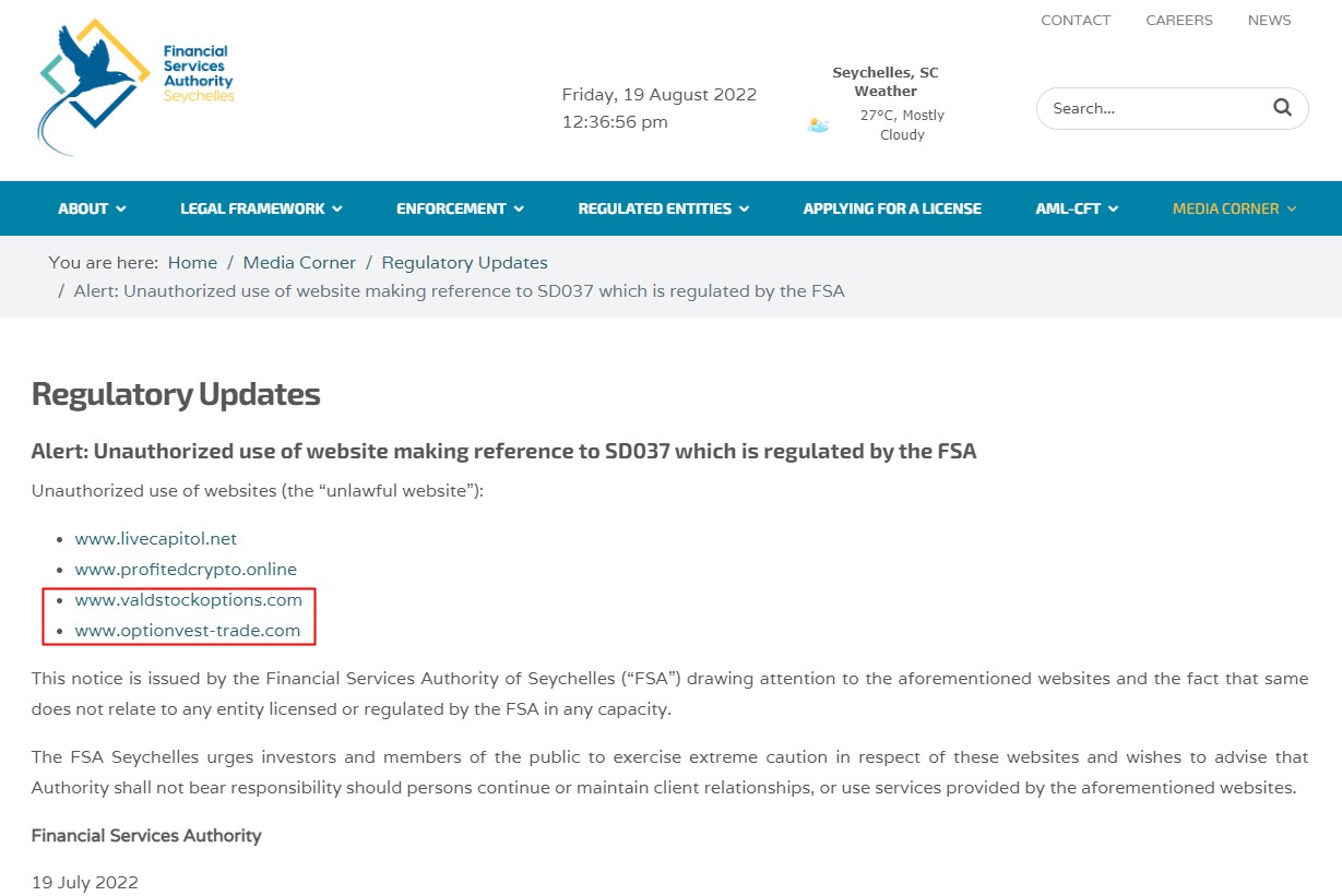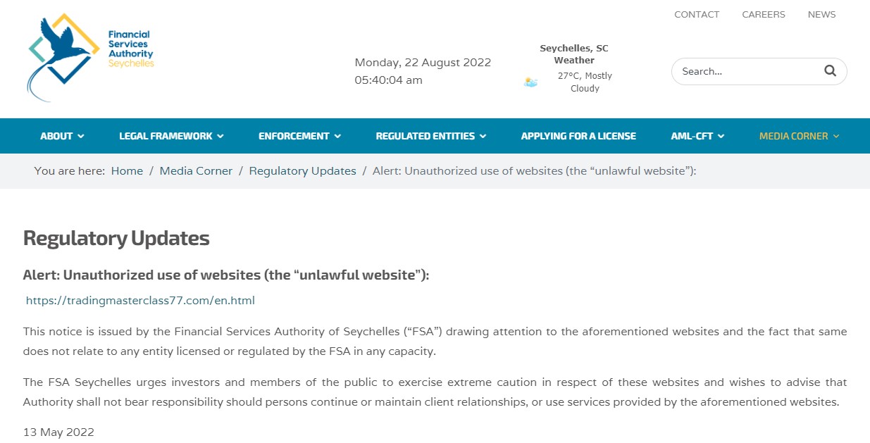 Moreover, the frauds also claim to be licensed by Seychelles FSA with the number SD037. However, the Seychelles FSA does not authorize their forex activities but issued warnings to them.