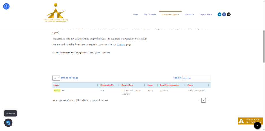 Amillex also claims another entity, Amillex LLC, registered in Saint Vincent and the Grenadines (SVG). This entity does exist as an IBC in the SVG FSA database, but incorporation does not imply any financial or forex license. The SVG FSA has long stated it does not regulate forex or brokerage business. Presenting “registration” as “regulation” is therefore deliberately misleading.
