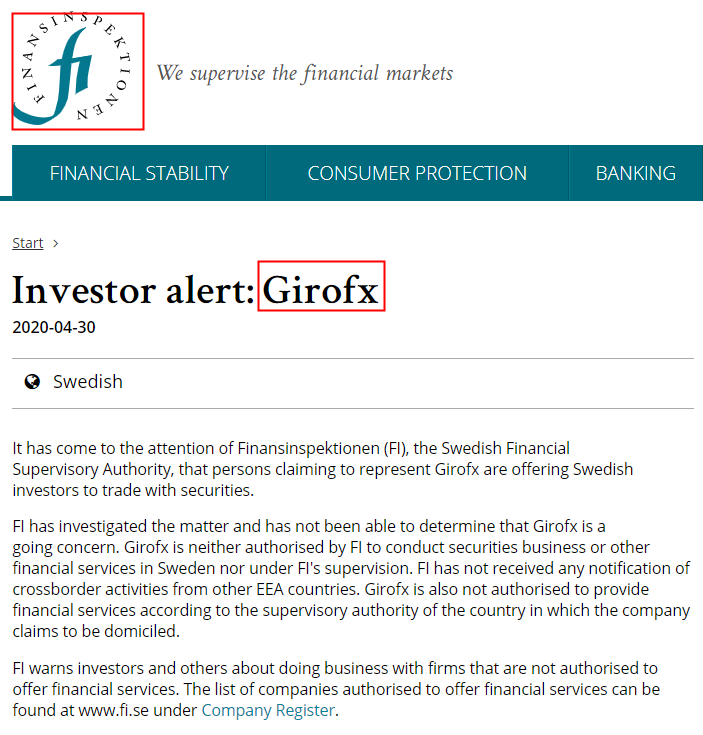 Furthermore, we found that on 20 April 2020, the fake broker was blacklisted by the Swedish Financial Supervisory Authority (FI). The regulator claimed that GiroFX is neither authorised by FI to conduct securities business or other financial services in Sweden nor under FI's supervision.