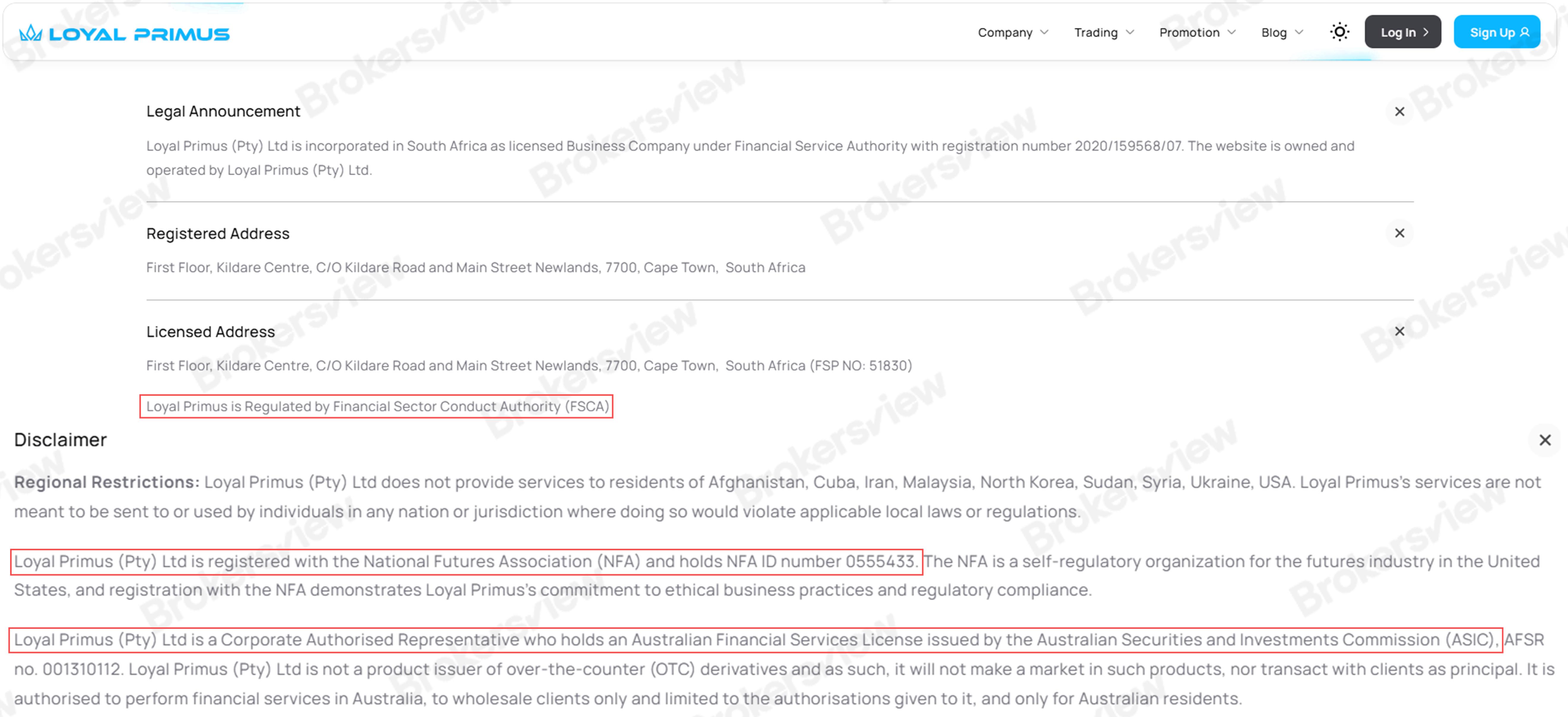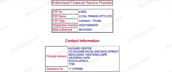 Loyal Primus asserts that it is regulated by the Financial Sector Conduct Authority (FSCA) under FSP number 51830. While this registration is valid, the FSCA does not disclose the broker’s website domain, making thorough verification difficult and raising concerns about transparency.