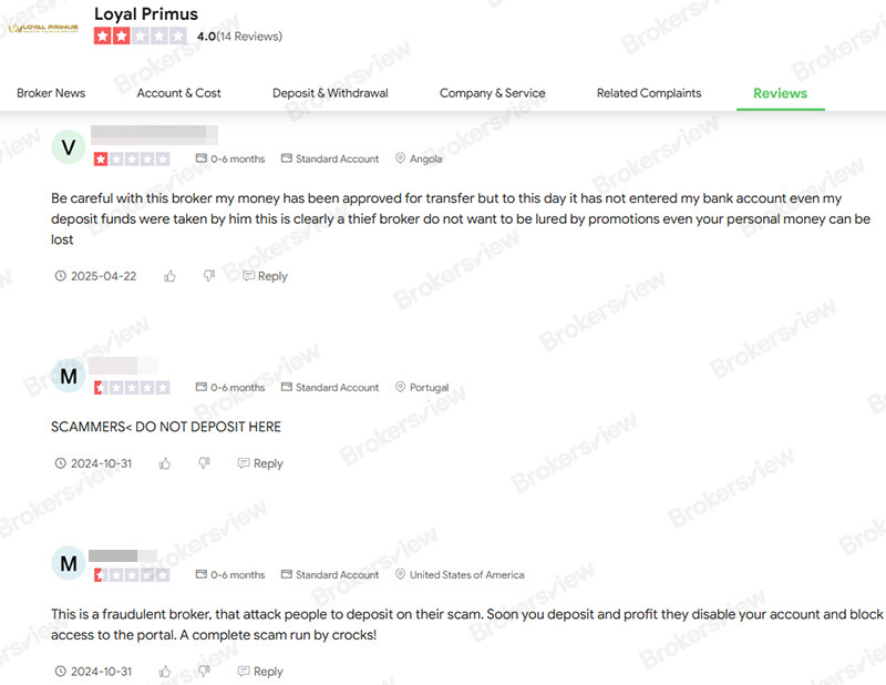 Loyal Primus's regulatory status has raised red flags, signaling a heightened risk of broker misconduct and potential fraud. The recent client complaint and client reviews further highlight these issues, citing approved but unaccounted-for withdrawals, abrupt account blocking, and vague claims of rule violation, which are common tactics associated with unreliable trading platforms.
