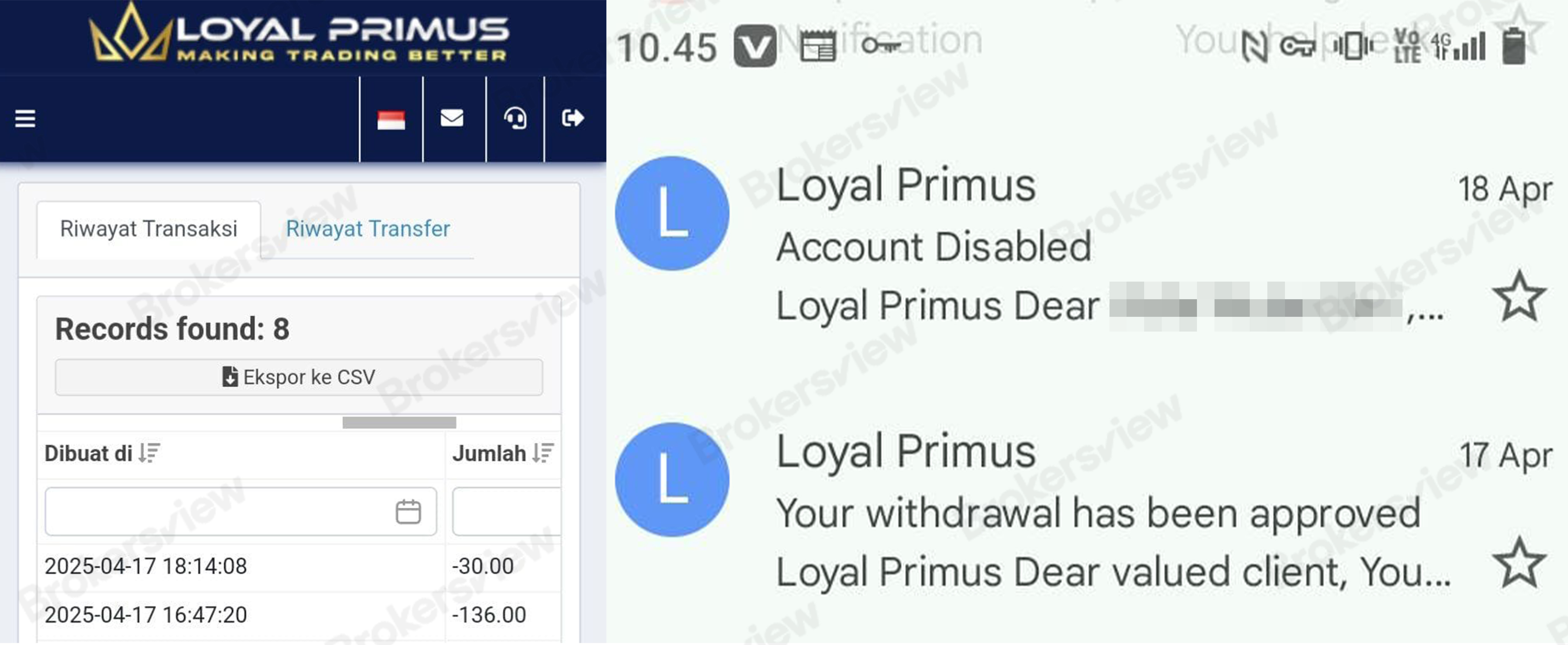 Screenshots provided by the trader show that he submitted withdrawal requests of $136 and $30 on April 17. That same day, Loyal Primus emailed him, confirming that the $136 withdrawal had been approved, but according to the trader, the funds didn’t reach his bank account. The following day, Loyal Primus sent another email notifying him that his account had been disabled, restricting his access to the platform.
