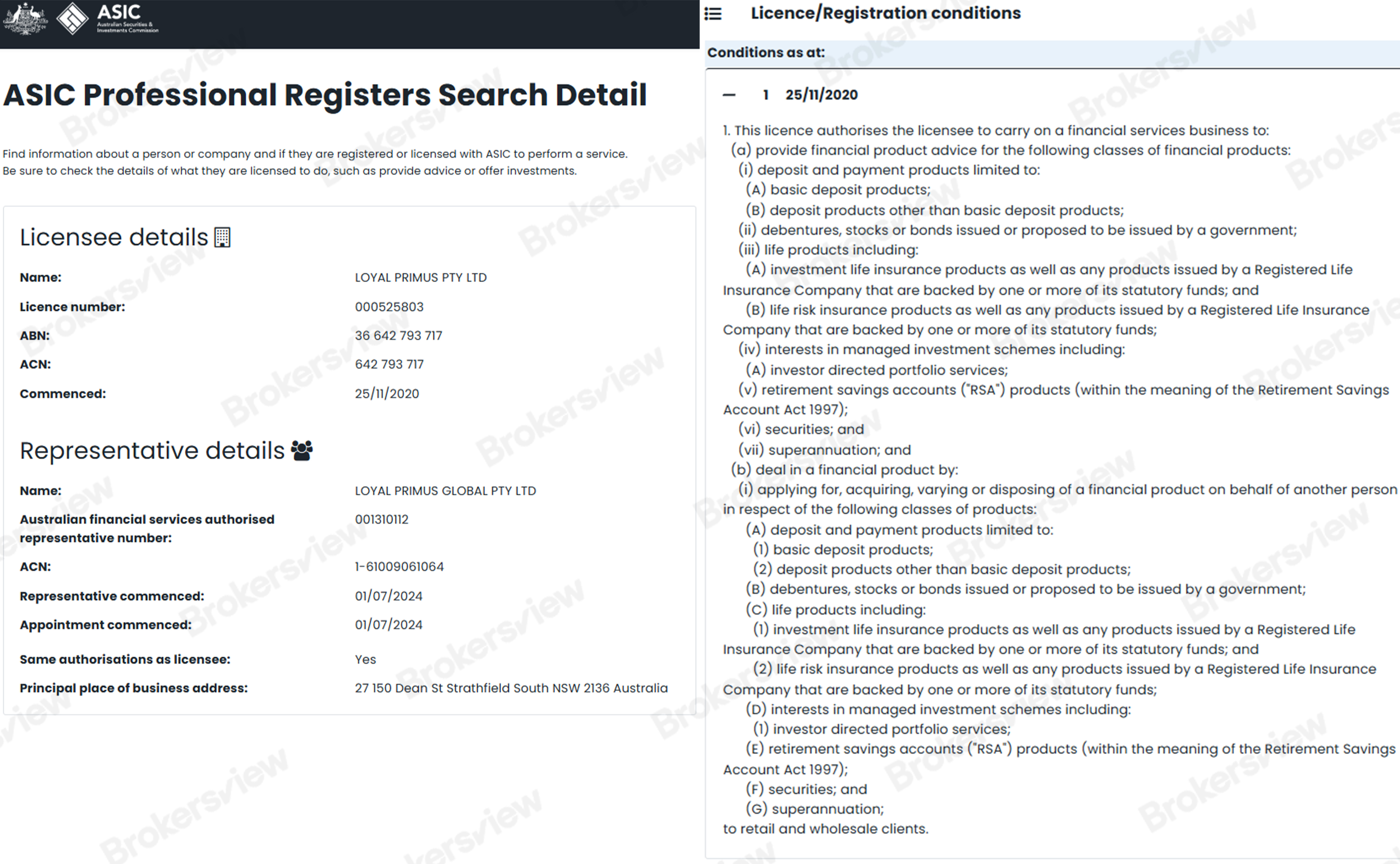 The broker also states that it is a Corporate Authorised Representative operating under an Australian Financial Services License (AFSL) issued by the Australian Securities and Investments Commission (ASIC), with AFSR number 001310112. While this registration is confirmed, an authorized representative does not directly hold an AFSL, and its activities are restricted by the licensee’s authorizations. Notably, our investigation found that the AFSL licensee associated with Loyal Primus is not authorized by ASIC to offer “foreign exchange contracts” or “derivatives”, raising further operational concerns.