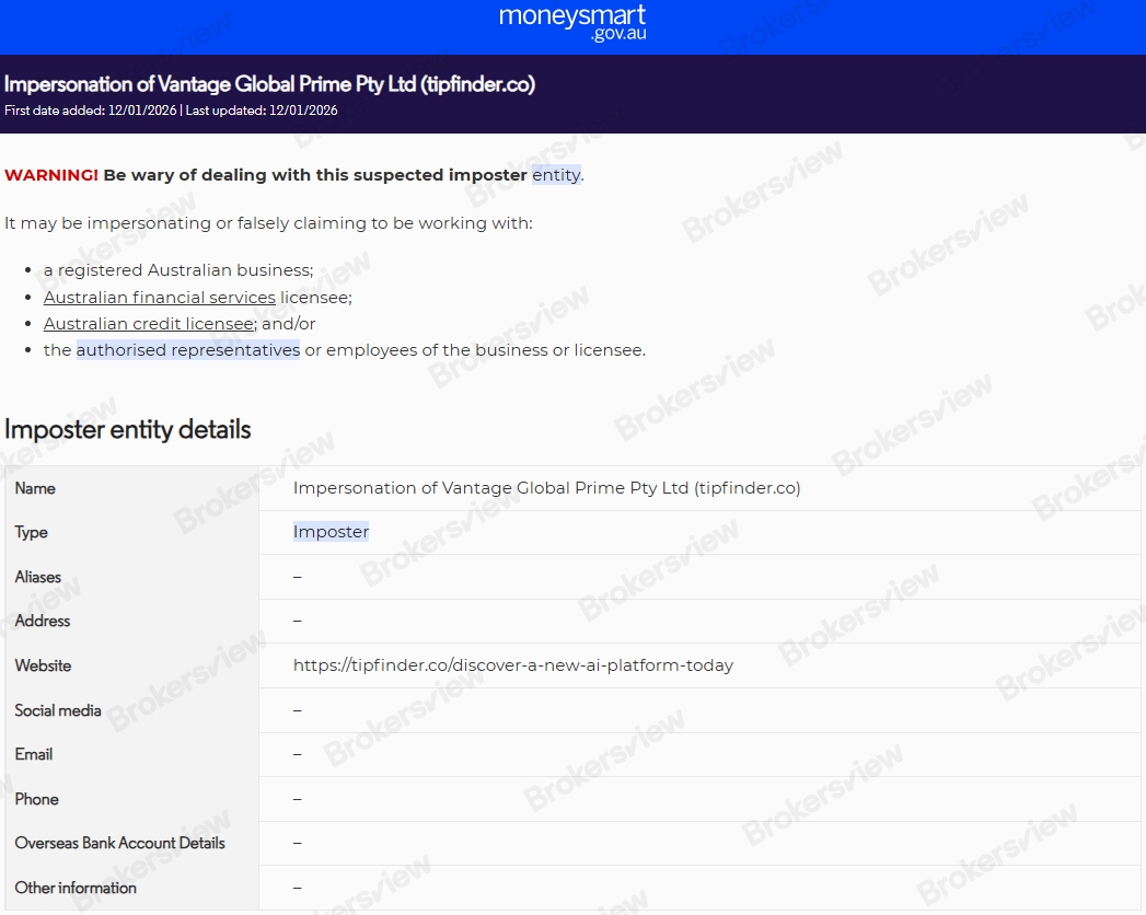 In light of the ASIC warning and the misuse of Vantage Markets’ licensing details, the public is strongly advised not to engage with TipFinder or anyone claiming affiliation with Vantage Global Prime Pty Ltd through this site.