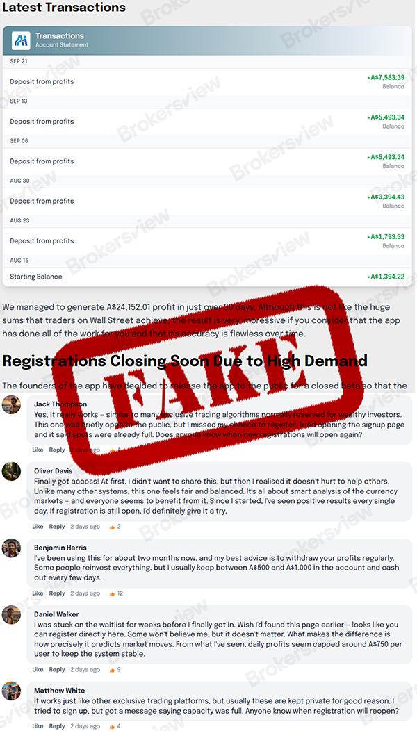 On the imposter website, Vantage Markets’ licensing details across other jurisdictions are also misused. The site promotes itself as a new AI trading platform, requiring an initial A$250 deposit for its bot to allegedly trade currencies, shares, or bonds. It claims deposits are refundable and transactions are completed within minutes to hours, even boasting that “average profit per user was just over A$14,700 per month.”