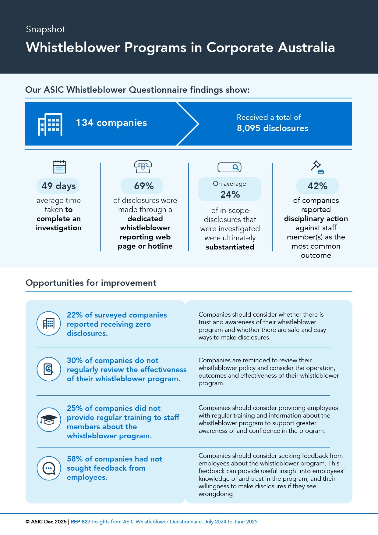 Through its Insights from the ASIC Whistleblower Questionnaire: July 2024 to June 2025, ASIC examined whistleblower policies and practices across 134 entities in 18 industries. The survey revealed significant variation in the maturity of whistleblower practices among different companies.
