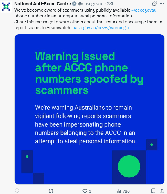Australia’s National Anti-Scam Centre (NASC) has issued a warning after scammers were found impersonating phone numbers belonging to the Australian Competition and Consumer Commission (ACCC) to steal personal information. These phone numbers are publicly available on the agency’s official website.