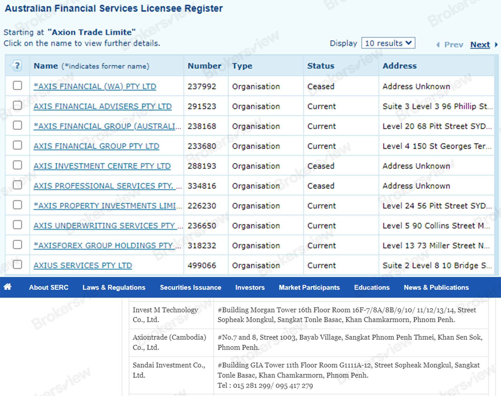 In addition, Axion Trade claims to be regulated by the Australian Securities and Investments Commission (ASIC), but only provides an Australian Company Number (ACN), and there is no licensing information relating to the company in ASIC's database. The broker also claims to be approved to operate as a derivatives broker by the Securities and Exchange Regulator of Cambodia (SERC), which does not regulate forex, although it does have records of the company.