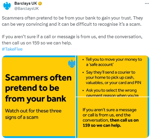 The bank urged its customers to terminate any suspicious conversations immediately and to verify the authenticity of the call or message by contacting Barclays directly on 159. "If you aren’t sure if a call or message is from us, end the conversation, then call us on 159 so we can help," the post concluded.