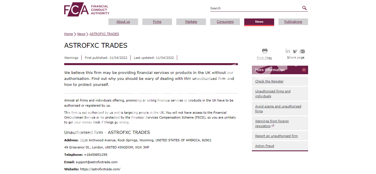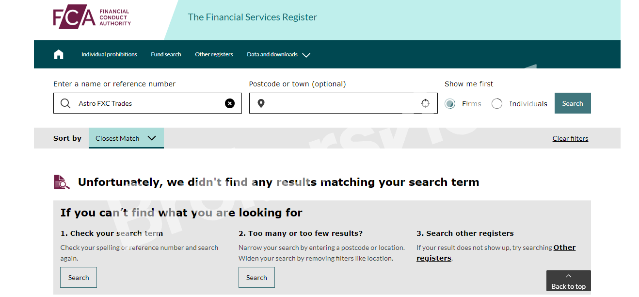 No! Astro FXC Trades isn't regulated. According to the broker's website, the company is based in the United Kingdom. Since all brokerage firms must hold registration with Financial Conduct Authority (FCA) to continue operations, we checked the British regulator's database to confirm the company's regulation and found no matching result.