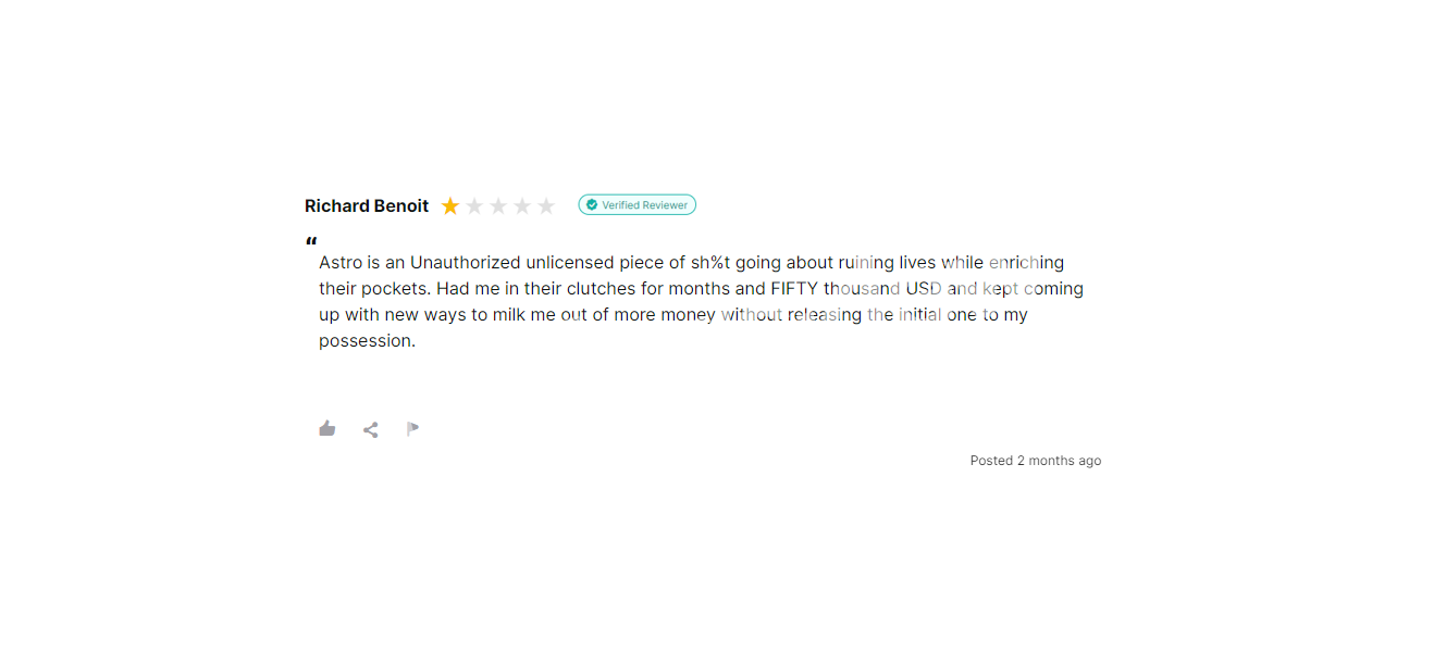 Astro FXC Trades holds a poor reputation amongst investors. Clients specifically denounce the company for withdrawal issues. According to customers, the broker always makes lame excuses when requested for withdrawals but never releases funds.