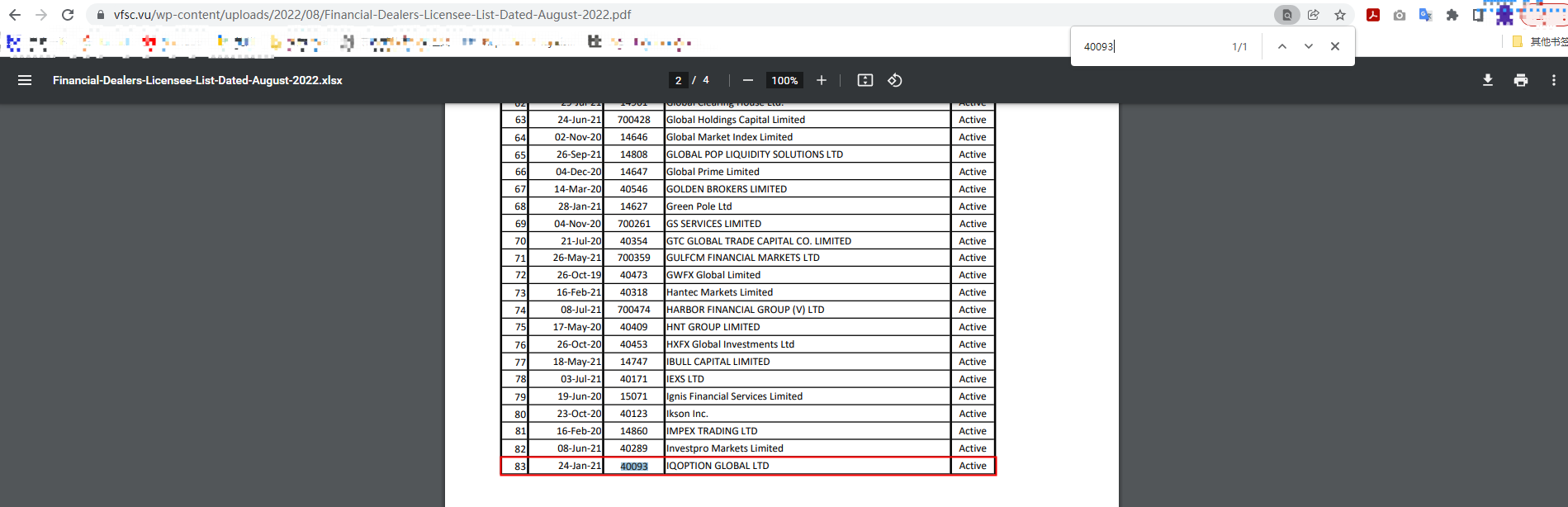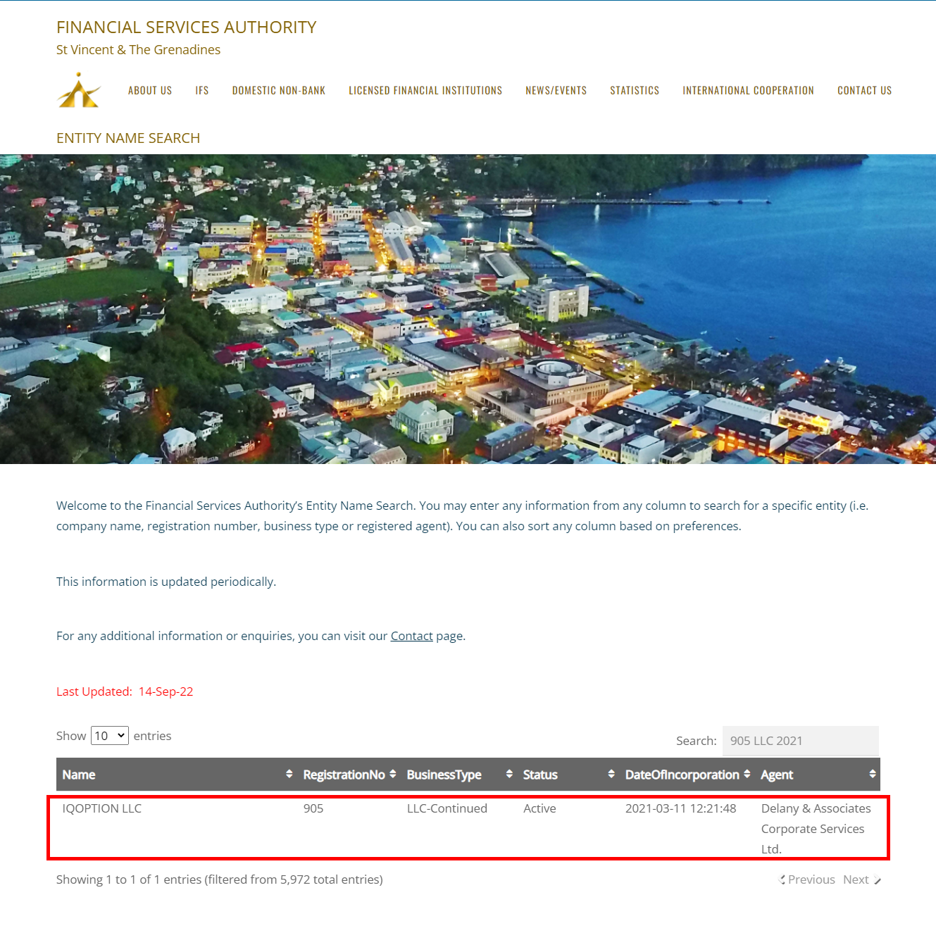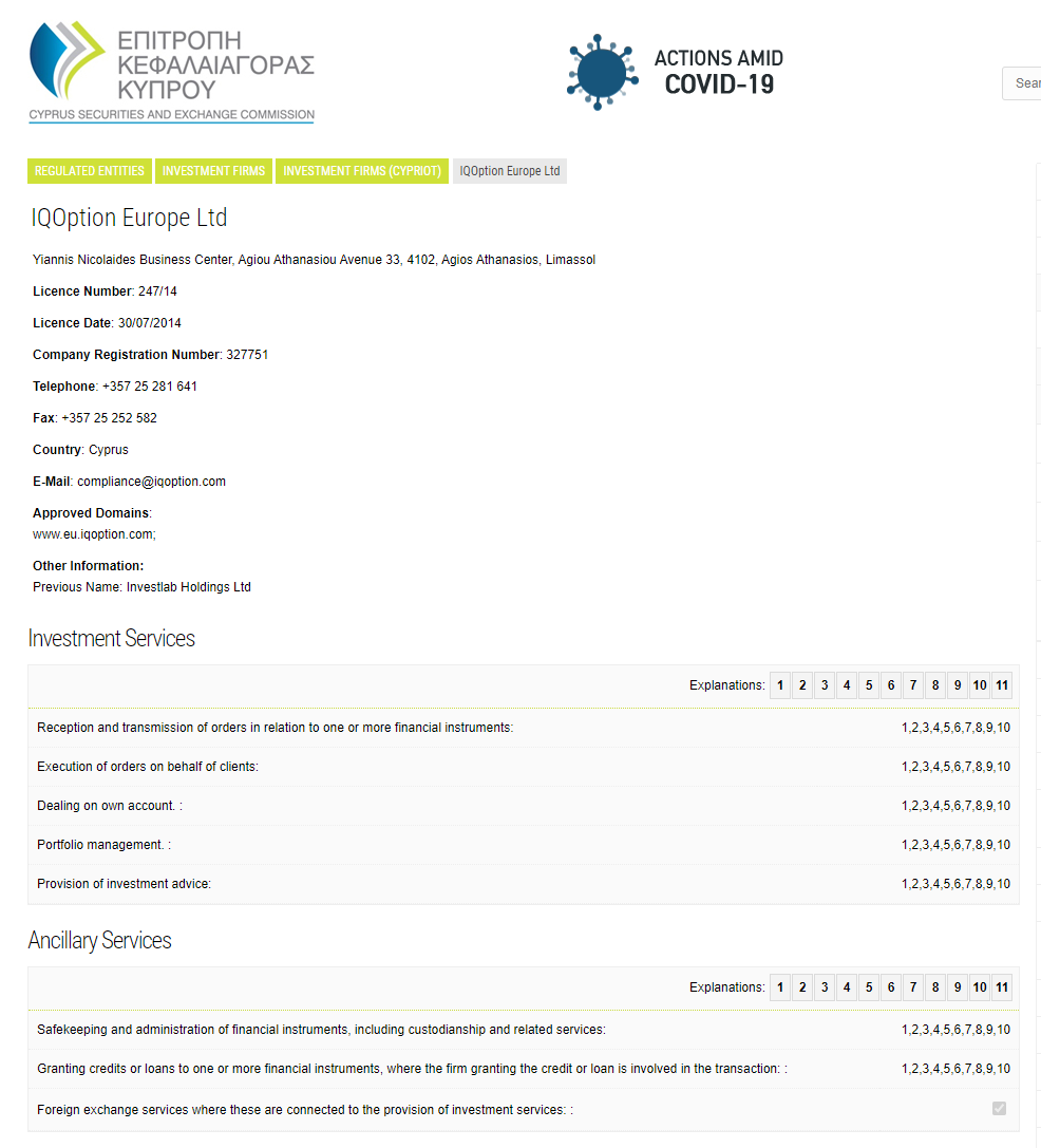 IQ Option is registered with SVGFSA and complies with CySEC regulations. In addition, brokers with similar names also appear in the VFSC register, but no other information is available, such as a website or a contact.
