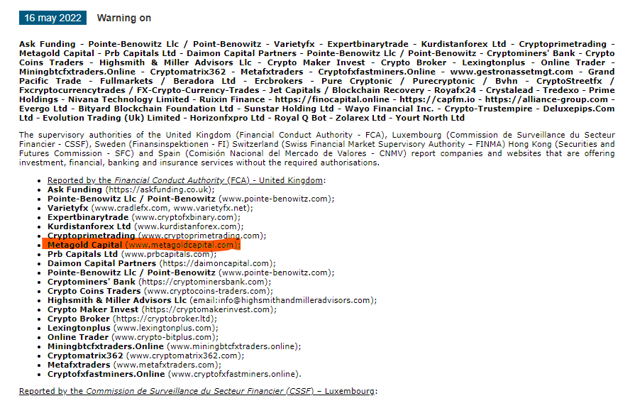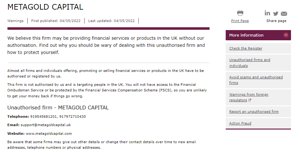 Yes! MetaGold was blacklisted by the British regulator Financial Conduct Authority (FCA), a few months ago. According to the regulator, the company was providing unauthorized financial services to the citizens of the United Kingdom.