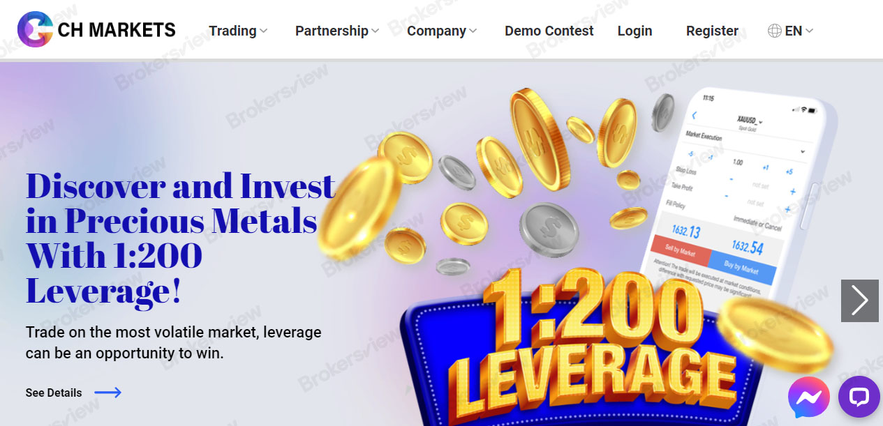 CH Markets (https://chmarkets.com/) is a financial services company offering online trading services in foreign exchange and other financial markets. The broker facilitates individuals and institutions looking to trade various financial instruments, including currency pairs, commodities, indices, and stocks. While a proprietary trading app is unavailable, clients may use the third-party trading platform - MT5. The company offers four account types but doesn't list the minimum deposit requirement, though it offers a 100% bonus on initial deposits to entice traders signing up with it. The broker also provides referral rewards via its affiliate program. Connecting with the company is possible via telephone, email, and live chat.
