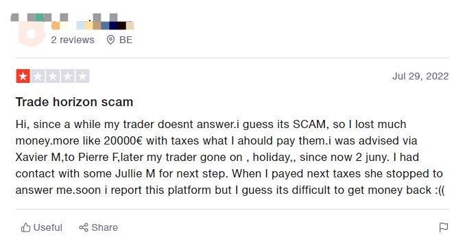 A victim was asked to pay tax and he or she did so. Once the unlicensed broker got the money, it used the holiday as an excuse to escape. The victim did not realize that Trade Horizon is a scam until he or she was not answered.