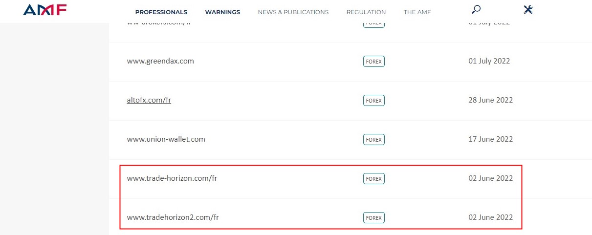 On 2 June 2022, the France Autorité des Marchés Financiers (AMF) issued a warning that Trade Horizon is not authorized to provide forex services in France.