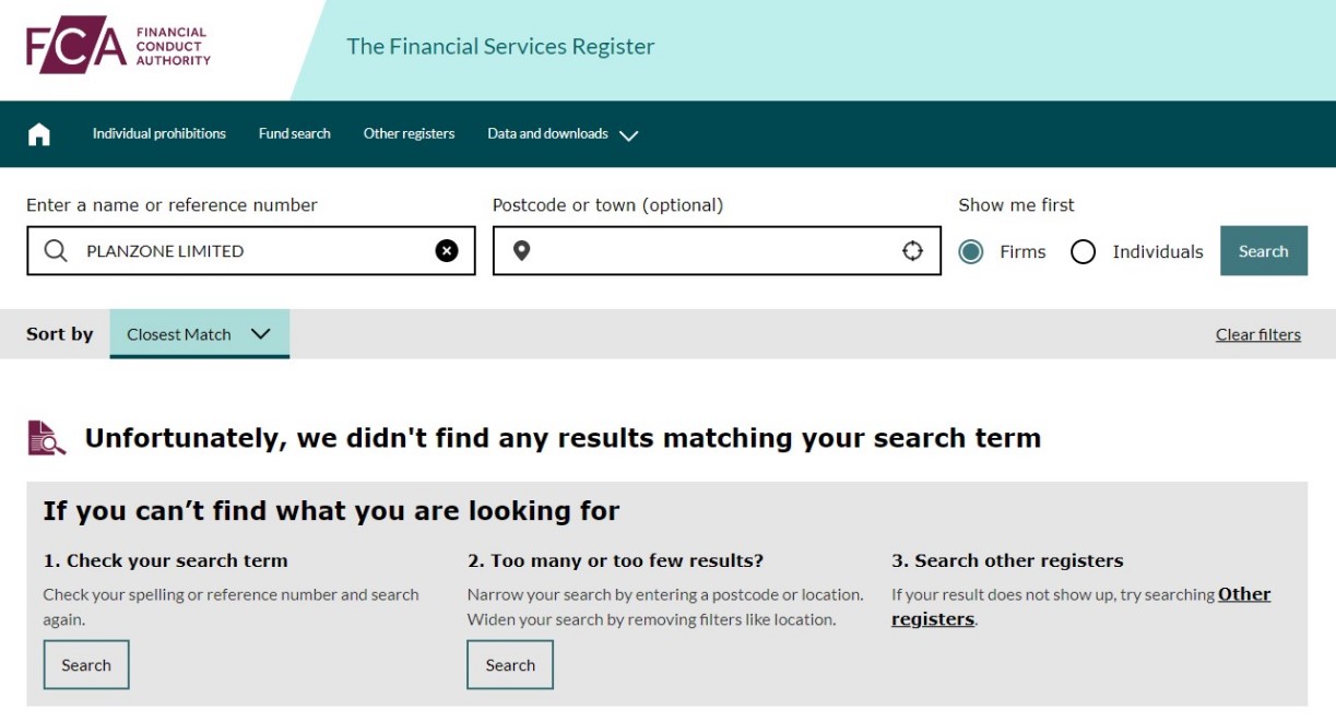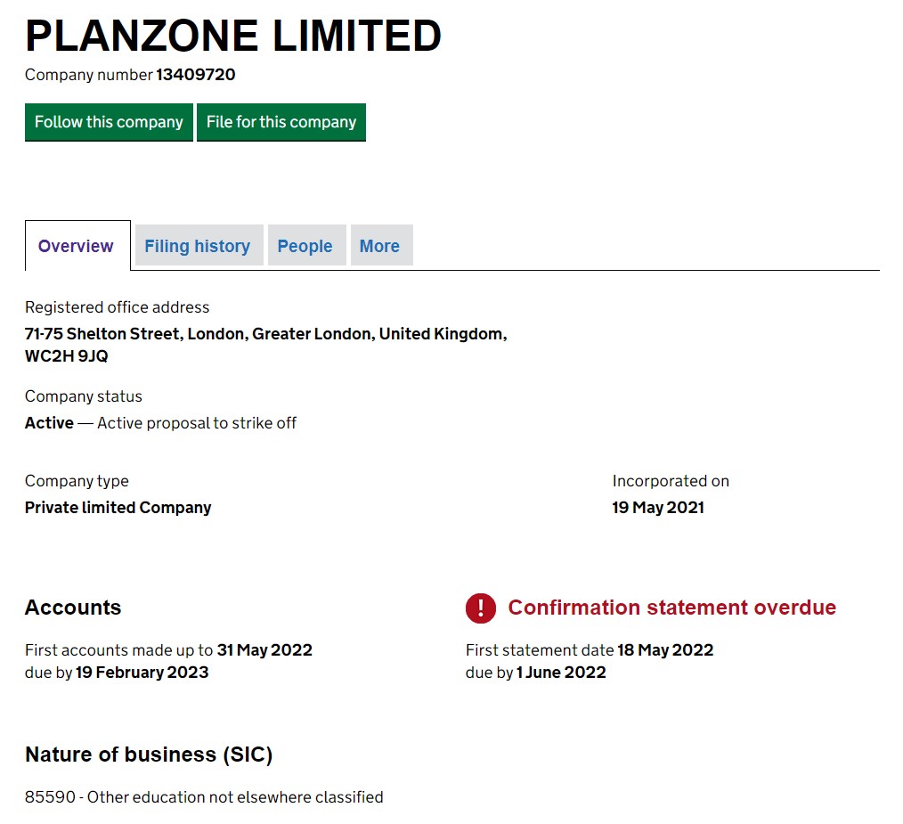 We searched Companies House of United Kingdom (CH) - the registrar of companies in the UK, and found a matching result. According to CH, the company status is noticed as "Active proposal to strike off", and the confirmation statement is overdue. In other words, the registration of Planzone LTD is abnormal. Besides, CH does not regulate forex activities.