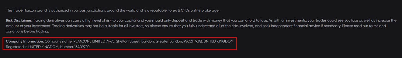 Planzone LTD, the company that owns Trade Horizon, claims to be incorporated in the UK under registration number 13409720.