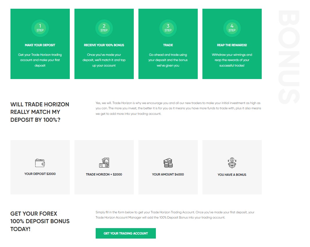 To attract traders to invest, forex brokers often offer bonuses for investors who deposit. For scammers, however, offering deposit bonuses is a method of fraud. Just like Trade Horizon, this fraudulent broker offers very attractive bonuses to its clients. However, not a penny of the bonus it promises will go into your pocket.