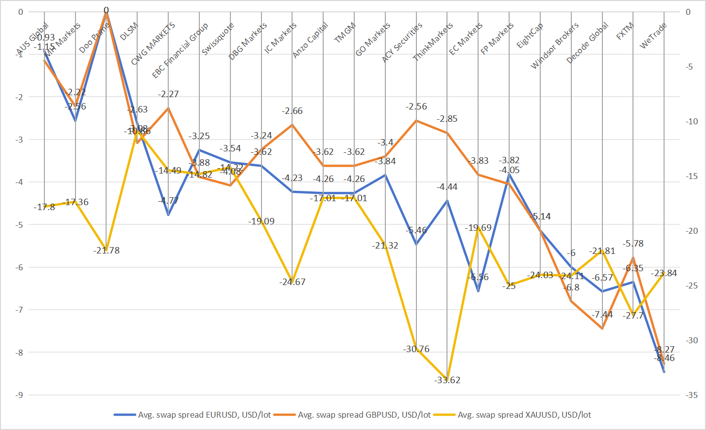 AUS Global consistently delivers the lowest swap costs across all three instruments. The shallow negative swaps on EUR/USD and GBP/USD make it especially attractive for forex swing traders.
