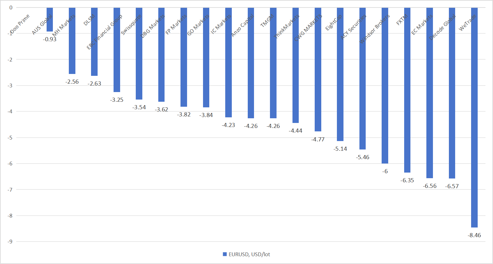 Brokers like WeTrade (-8.46) and Decode Global (-6.57) carry the highest EUR/USD swap costs, potentially eating into long-term profits.