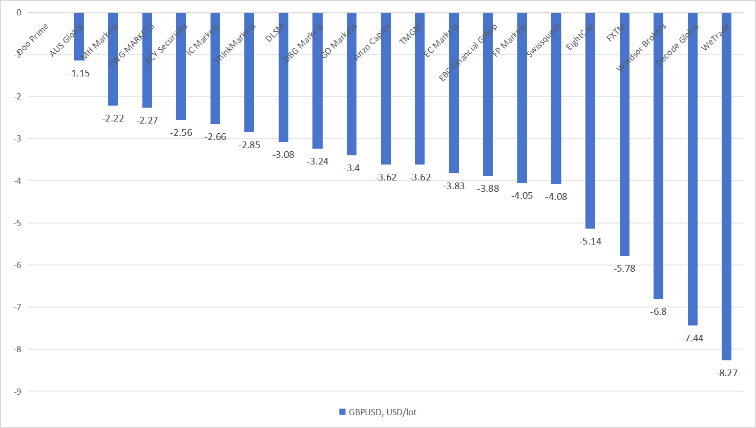 WeTrade (-8.27) and Windsor Brokers (-6.80) offer some of the least favorable GBP/USD swap conditions.