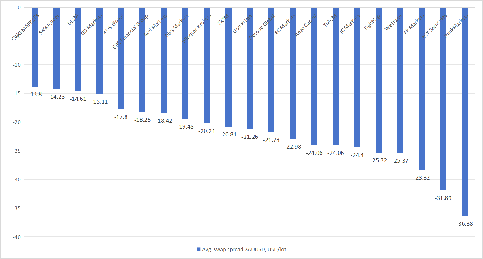 Swissquote ranked second, with an average swap spread of –14.23 USD per lot. While slightly higher than CWG Markets, Swissquote’s established reputation and regulatory standing may offset the marginally higher swap costs. For traders prioritizing security and global brand trust, Swissquote remains a strong contender.