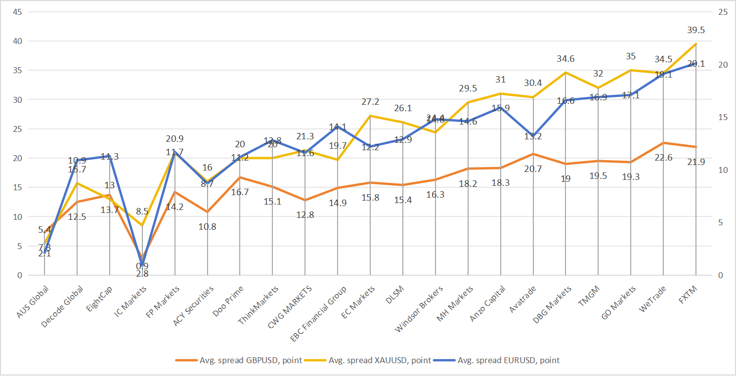 - AUS Global secures second place with a 7.3-point average spread. While not as tight as IC Markets, it still provides a relatively stable trading environment. Its performance makes it suitable for swing traders and day traders who prioritize a balance between cost and reliability.