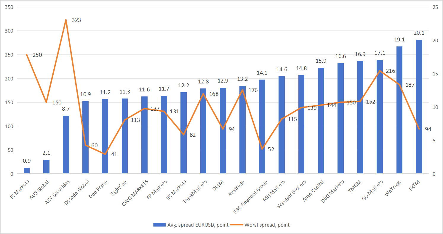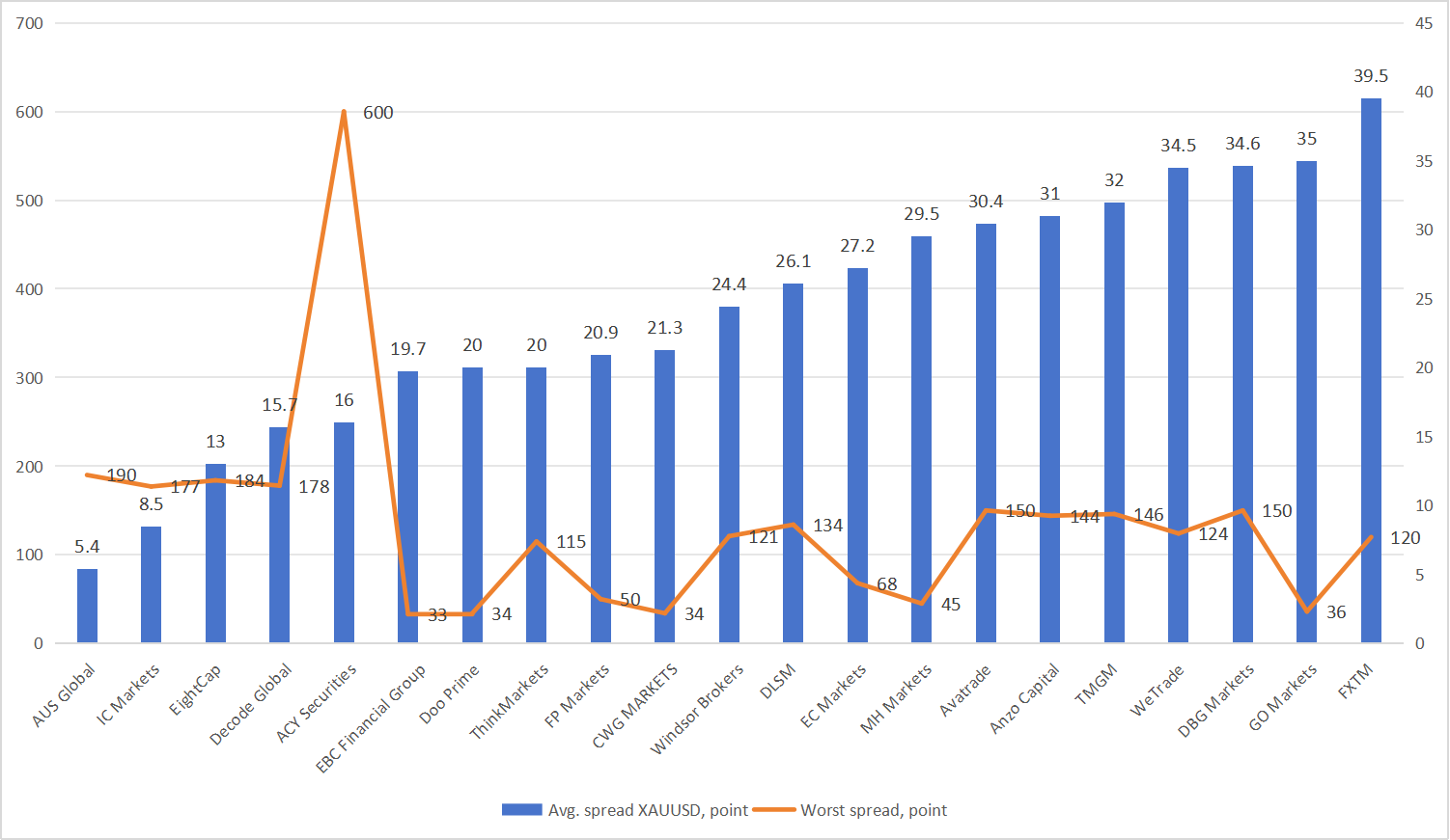 - EightCap takes third place with a 13-point average spread. While less competitive than AUS Global or IC Markets, it remains a reasonable option for traders who value balance between pricing and platform features. Its worst spread of 184 points indicates decent stability during market swings.