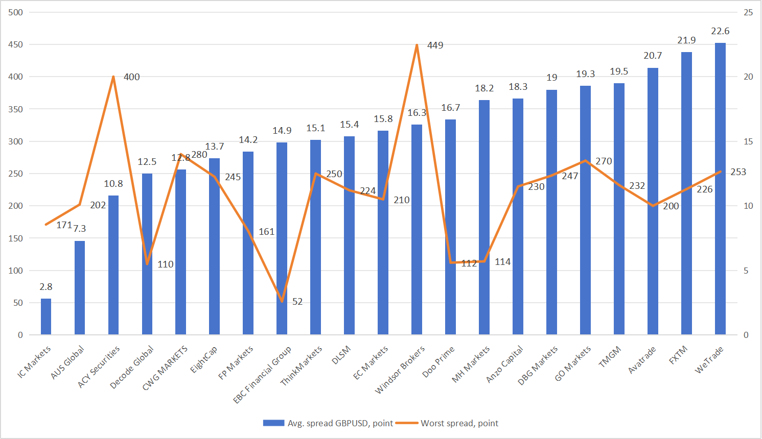 - IC Markets takes the lead with the lowest average spread on GBP/USD. At just 2.8 points, it offers traders highly competitive pricing, especially for high-frequency and short-term strategies. While worst-case spikes can still occur, IC Markets remains the most cost-efficient choice for trading Cable this month.