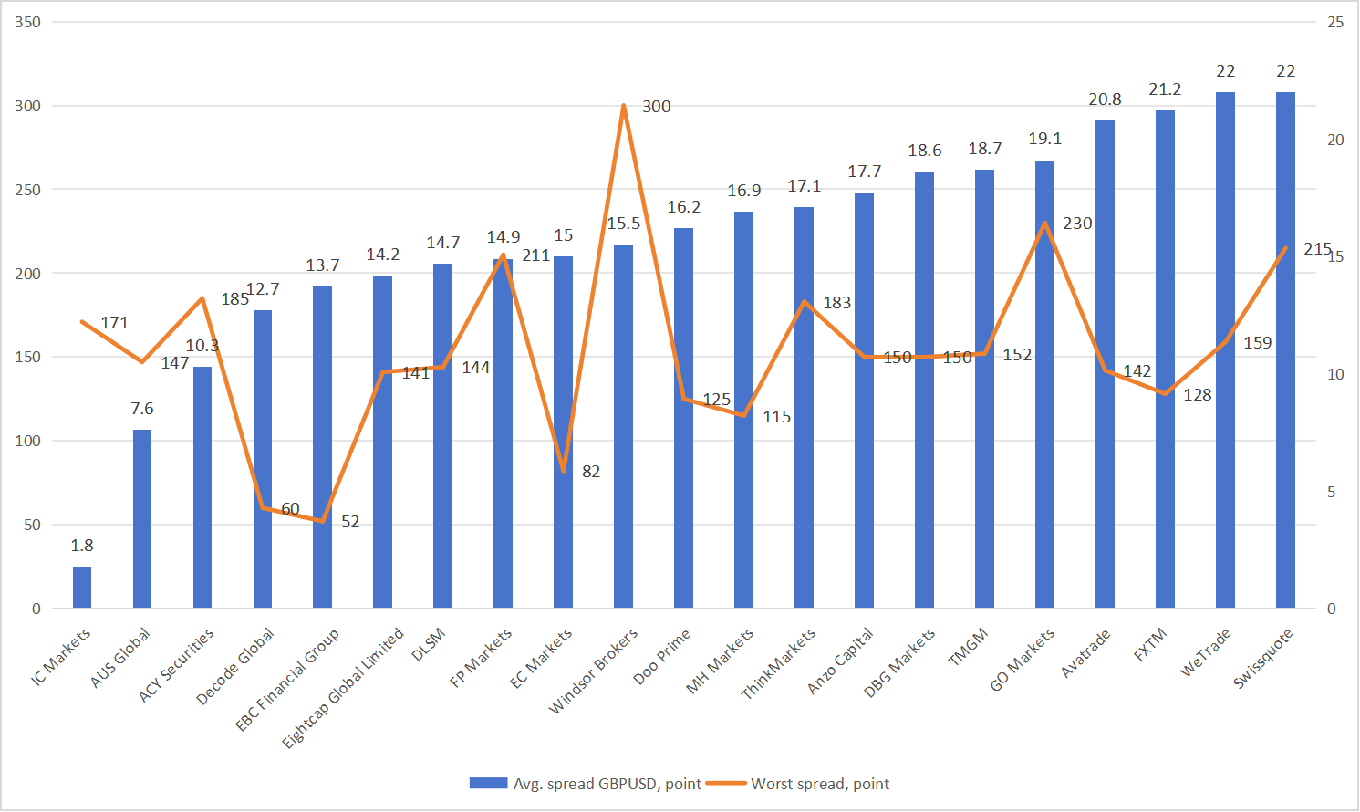 IC Markets stands out as the leader in tight spreads for GBP/USD. While occasional spikes can reach 171 points, its overall pricing remains among the most competitive in the market.