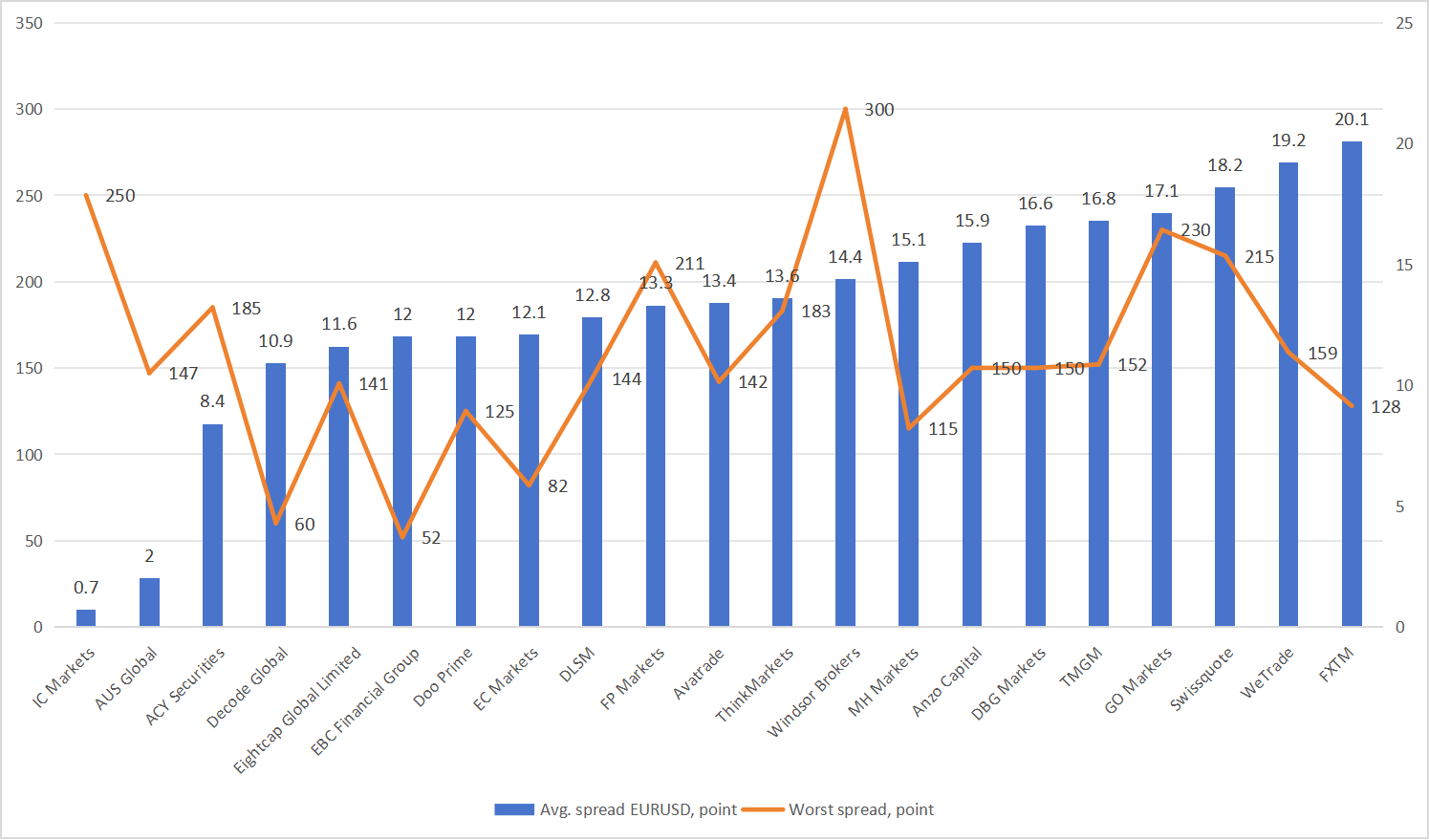 With an exceptionally low average spread, IC Markets is the top choice for active traders and scalpers. Even though the worst spread occasionally widens during volatile conditions, the broker consistently delivers efficient execution and minimal trading costs.