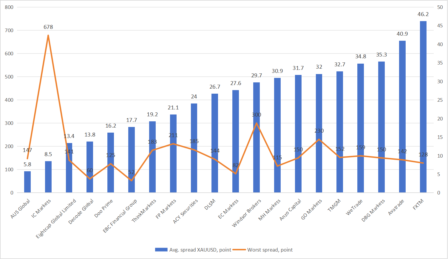 AUS Global recorded the lowest worst-case spread among the top three, indicating relatively steady performance even under market pressure. This makes it a good option for swing and day traders looking for reliability over ultra-tight spreads.