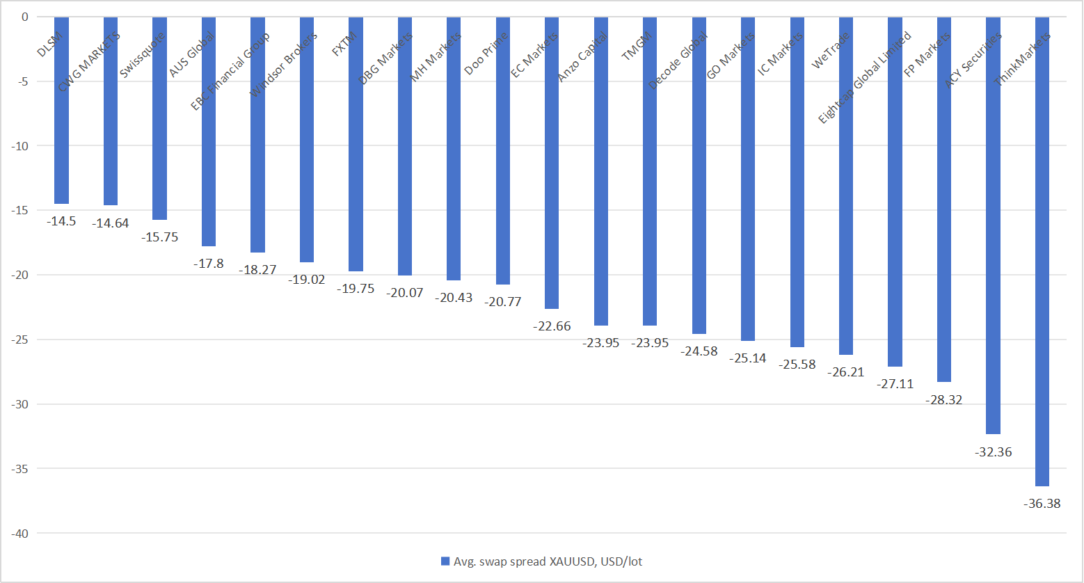 DLSM offered the lowest overnight cost for XAU/USD, making it the most attractive choice for traders looking to minimize holding fees.