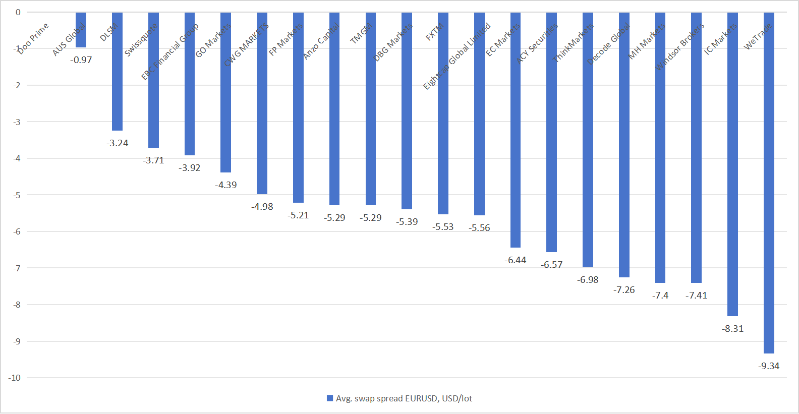 AUS Global secures the second position with an average swap spread of -1.19 USD/lot, one of the lowest in the market. This makes AUS Global an excellent choice for traders seeking low-cost overnight exposure without the complexities of hidden fees.
