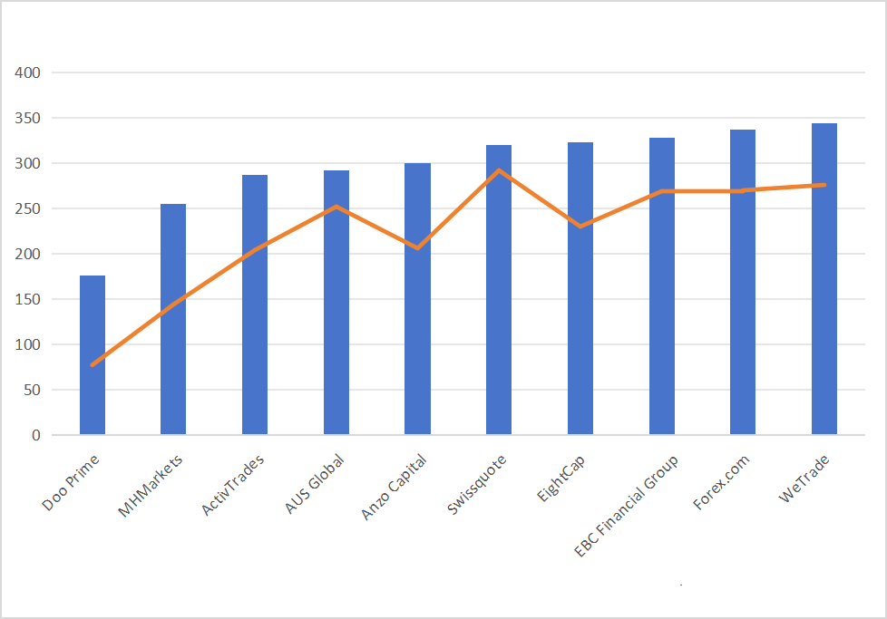 Figure 1 shows that Doo Prime boasts the best average trading speed, enabling it to complete orders in the shortest time. MHMarkets and ActivTrades are not far behind Doo Prime with excellent performance. Doo Prime achieves the optimal single speed of 77 milliseconds, while MHMarkets achieves an impressive speed of 144 milliseconds.