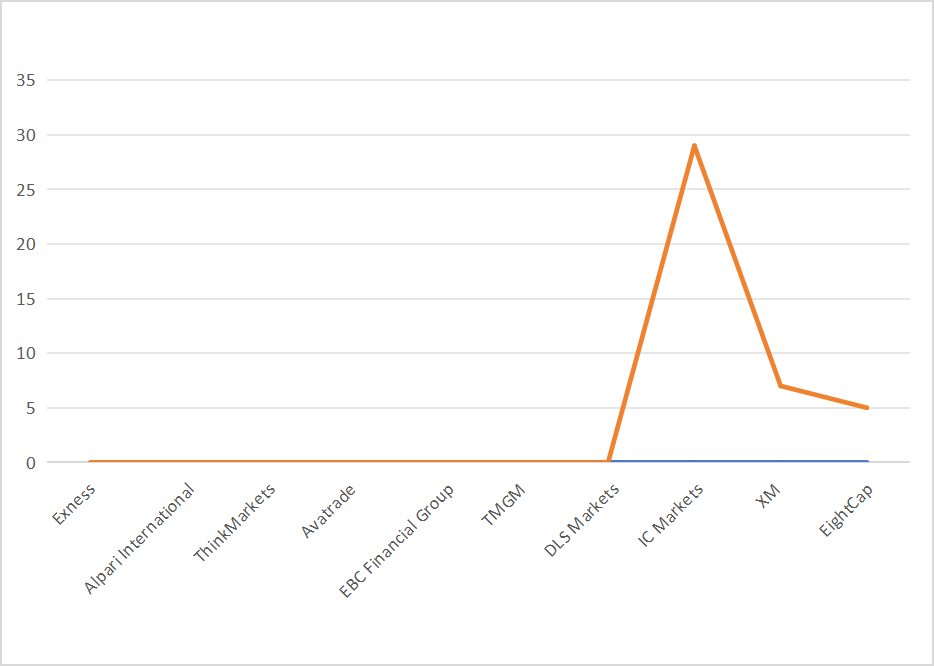 From Figure 2, the "average number of daily disconnections" for these ten brokers is uniformly 0.0. Regarding the "average reconnection time," except for IC Markets' 29 seconds, XM's 7 seconds, and EightCap's 5 seconds, the remaining brokers all show a reconnection time of 0, suggesting comparable stability among these platforms.