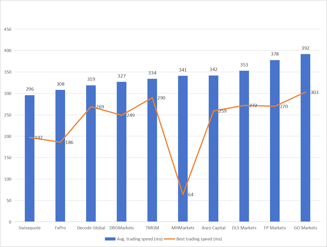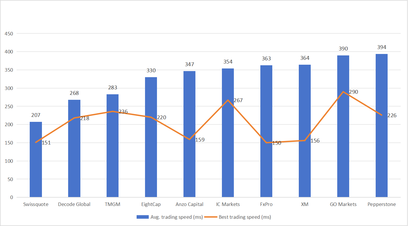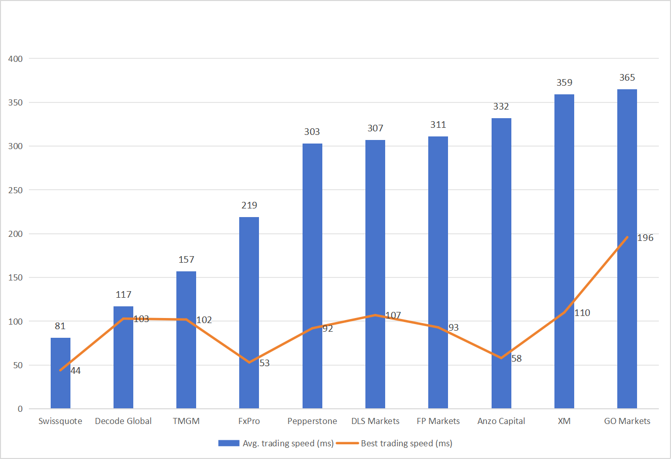 In the Dubai market, Swissquote has the fastest average transaction speed of 207 milliseconds, and the fastest transaction speed can reach 155 milliseconds. Decode Global's average transaction speed is relatively slow, at 268 milliseconds, and the fastest transaction speed is 218 milliseconds. TMGM has an average transaction speed of 293 milliseconds and a maximum transaction speed of 236 milliseconds. The best speed was 150 milliseconds for FxPro and 151 milliseconds for Swissquote.