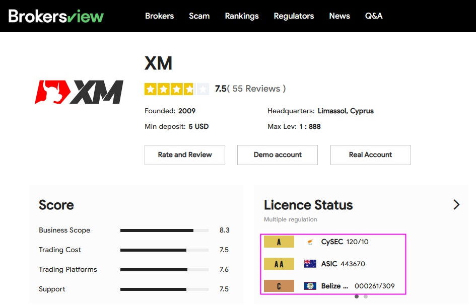 Founded in 2009, XM operates under the brand name of XM Global Ltd, based in Limassol, Cyprus. The company is a member firm of Trading Point Group. With a full suite of MT4 and MT5 trading platforms, and multiple account types, the brokerage claims to have evolved into the world's most reputable investment firm. It provides retail and institutional trading services across various financial markets, including forex, indices, stocks, energies and commodities. The company holds multiple regulations from the various regulators worldwide, including Australian Securities and Investment Commission (ASIC – 443670), Cyprus Securities and Exchange Commission (CySEC – 120/10), Belize Financial Services Commission (Belize FSC - 000261/309) and DuBai Financial Services Authority (DFSA – F003484).