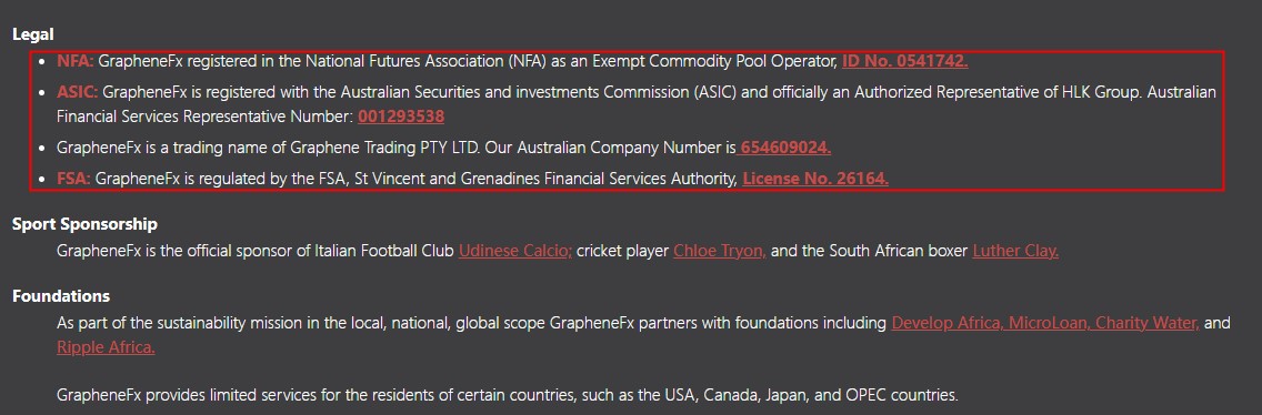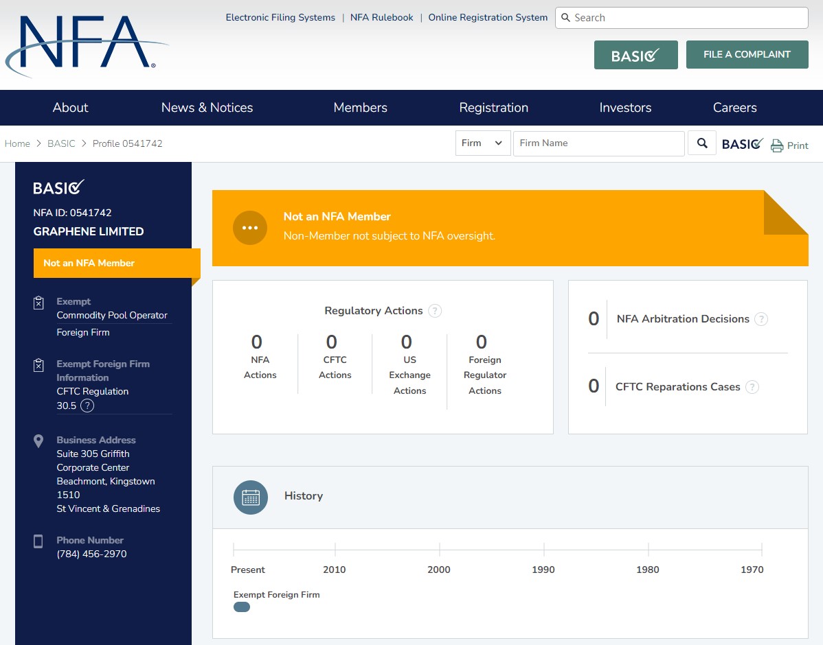 GrapheneFx also claims to be registered with NFA, ID No. 0541742. So we searched the NFA register and found a company named GRAPHENE LIMITED. However, please do not be confused and know that the company is not authorized to sell forex products. Since it is not an NFA member, the broker is not under the valid regulation of NFA.
