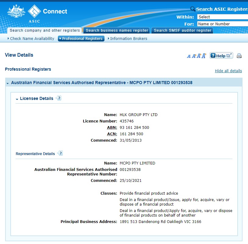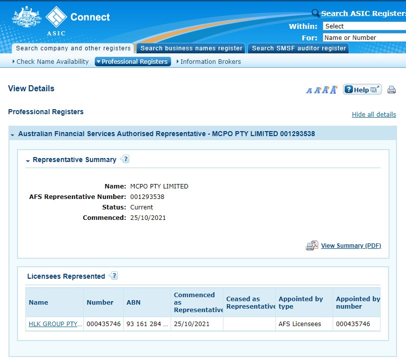 However, the weird thing is that we can not find any matching results in the Australia Business Register by searching the broker's ACN number: 654 609 024, which means that MCPO PTY Limited may not be an Australian company as it claims.