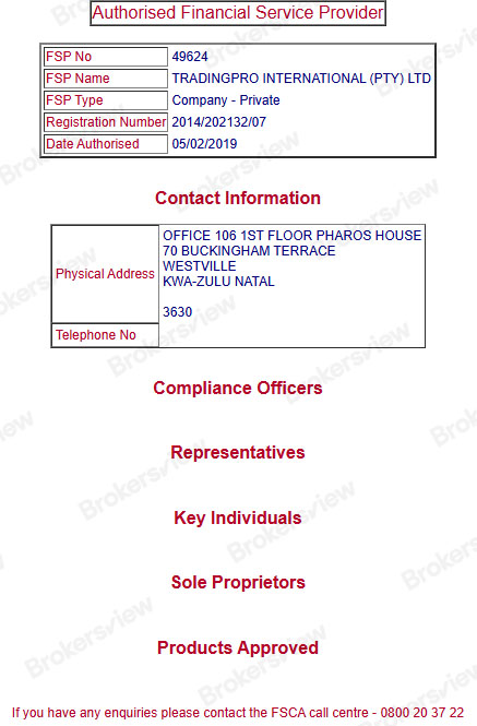 TradingPro also operates a Nigerian entity, authorized by the Financial Sector Conduct Authority (FSCA) of South Africa as a financial services provider. However, the FSCA does not disclose the website domain for verification, and its oversight is less stringent than top-tier regulators. Therefore, the entity provides a lower level of investor protection.