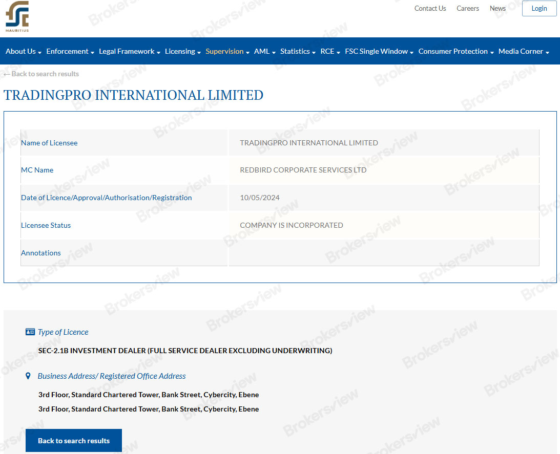 TradingPro holds a license from the Mauritius Financial Services Commission (FSC) as an investment dealer, but the regulator does not disclose the website domain for verification. Additionally, the Mauritius FSC's offshore oversight is lax, increasing the likelihood of broker misconduct.