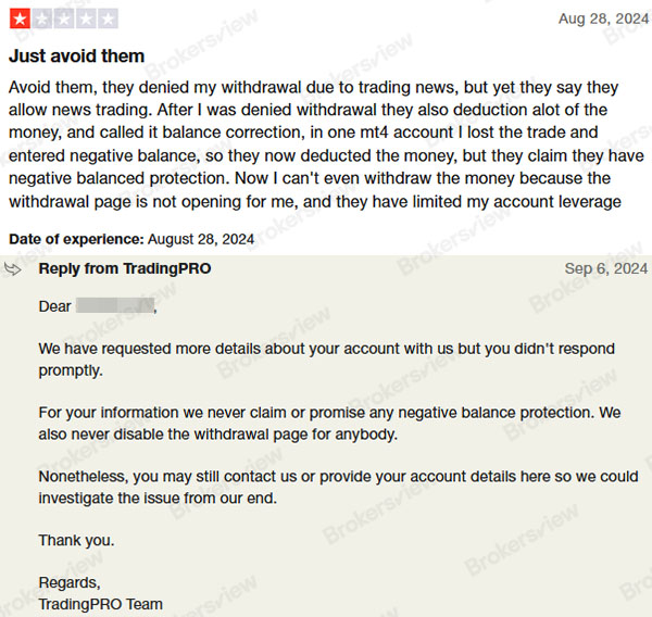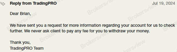 Despite these issues, TradingPro responded that it never asks clients for withdrawal fees, attempting to clarify.