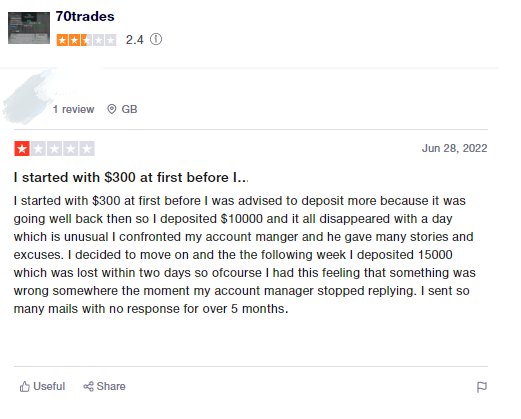 In addition, negative customer feedback on several websites speaks ill of 70Trades. On BrokersView, the company is only rated 4.7 out of 10 stars. 1.083/5 rate on a forex forum and 71% of negative feedback on a review website shed enough light on the broker's affairs and reputation.