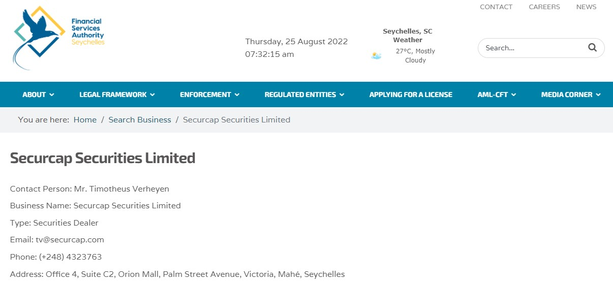 70Trades is the brand name of Securcap Securities Limited, based in Seychelles. The broker operates under the authorization of Seychelles Financial Services Authority with License (Seychelles FSA) No. SD012. And it isn't registered or regulated anywhere else.