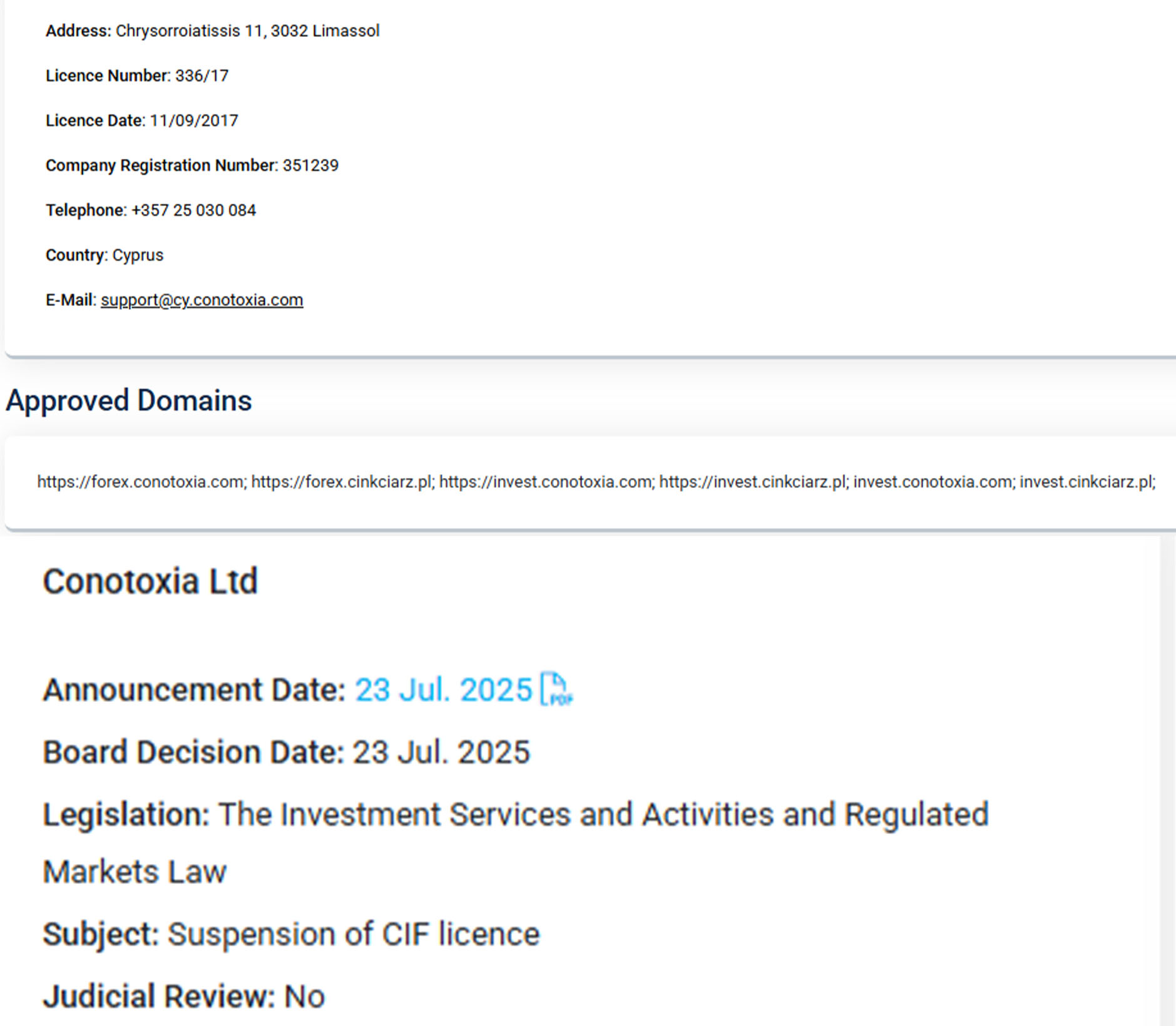 The Cyprus Securities and Exchange Commission (CySEC) has announced a full suspension of the authorisation of the Cyprus Investment Firm (CIF) for Conotoxia Ltd, citing alleged regulatory violations. The company holds CIF license number 336/17 and operates as a forex and CFD trading service provider under the Polish-based Conotoxia Holding Group.