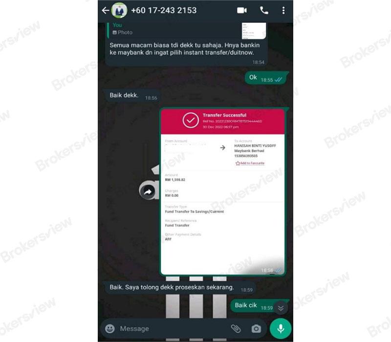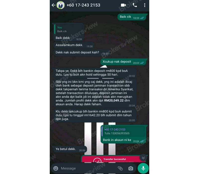 Later, the scammer suggested that since the client's account has never received any transaction from the United States, she need to deposit RM800 to BOA and let the bank hold the "security deposit" for 50 days. The deposit would be returned to her account after the bank approved the transaction, and the total profit received would be 20049.22 ringgit. Again, she transferred another RM800 to it.